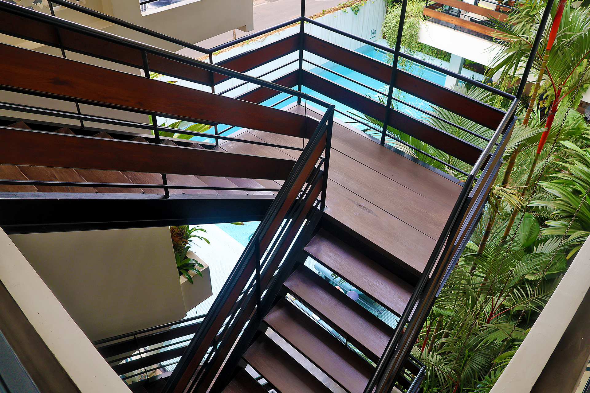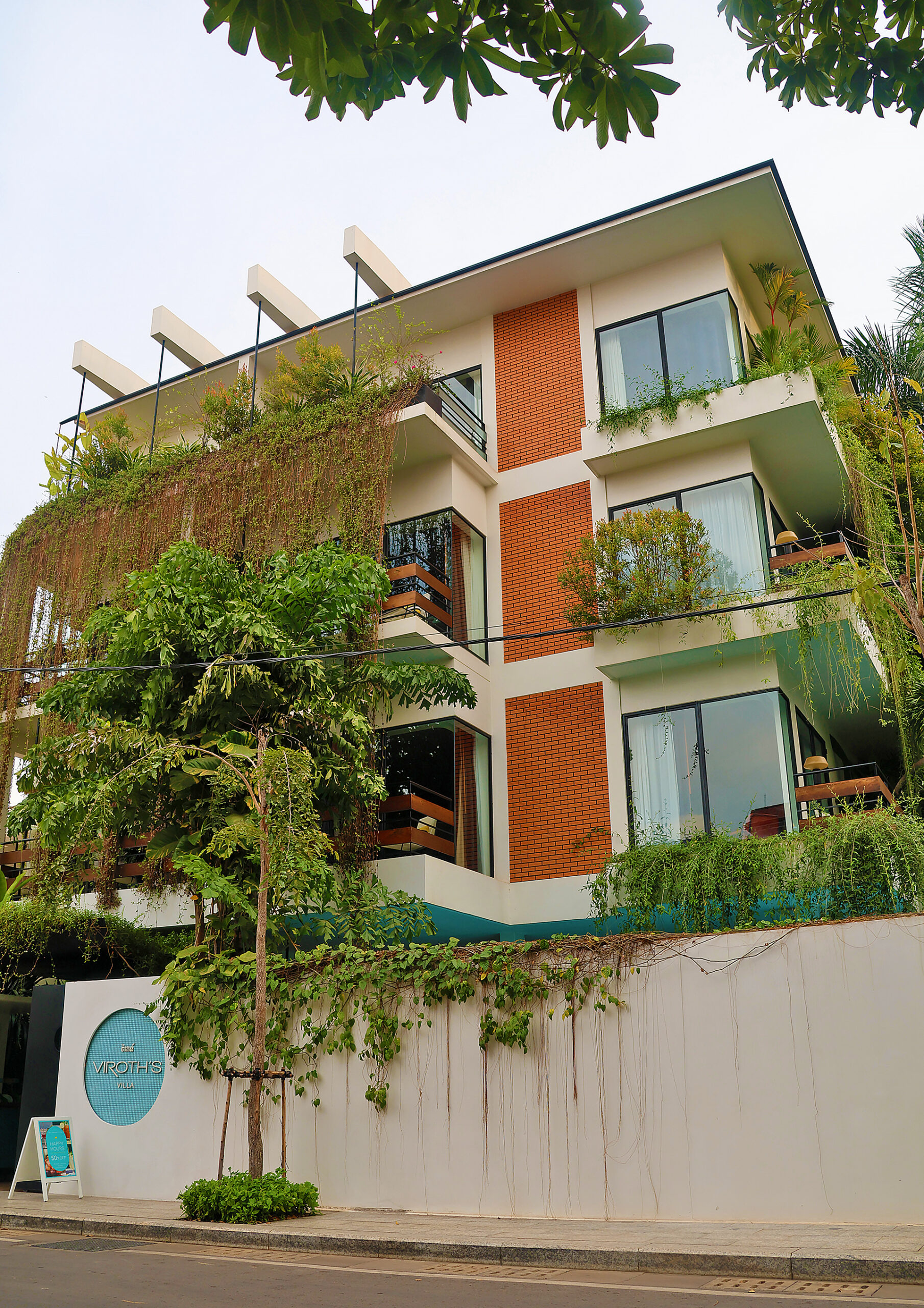 Two buildings were part of Viroth’s Villa: one which was four stories tall; and the other which was three stories tall. The common open-air area of the boutique hotel property was between the two buildings.