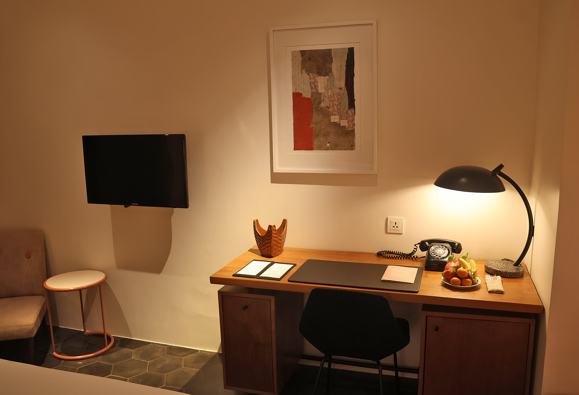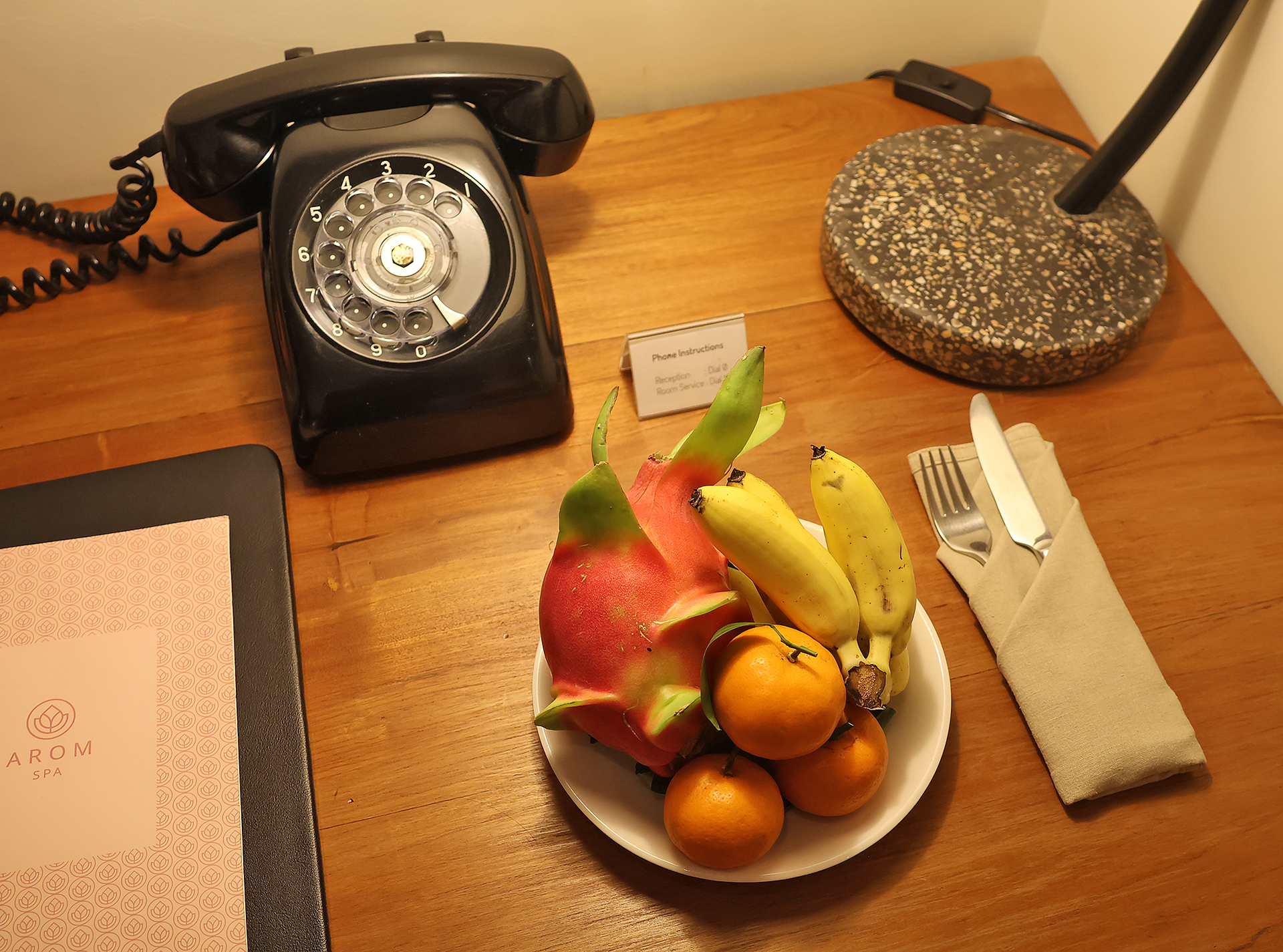 On the desk was an old-style rotary telephone, a lamp, a desk blotter, a note pad, and a welcome amenity that was comprised of a whole dragonfruit, a bunch of miniature bananas, and some mandarin oranges.
