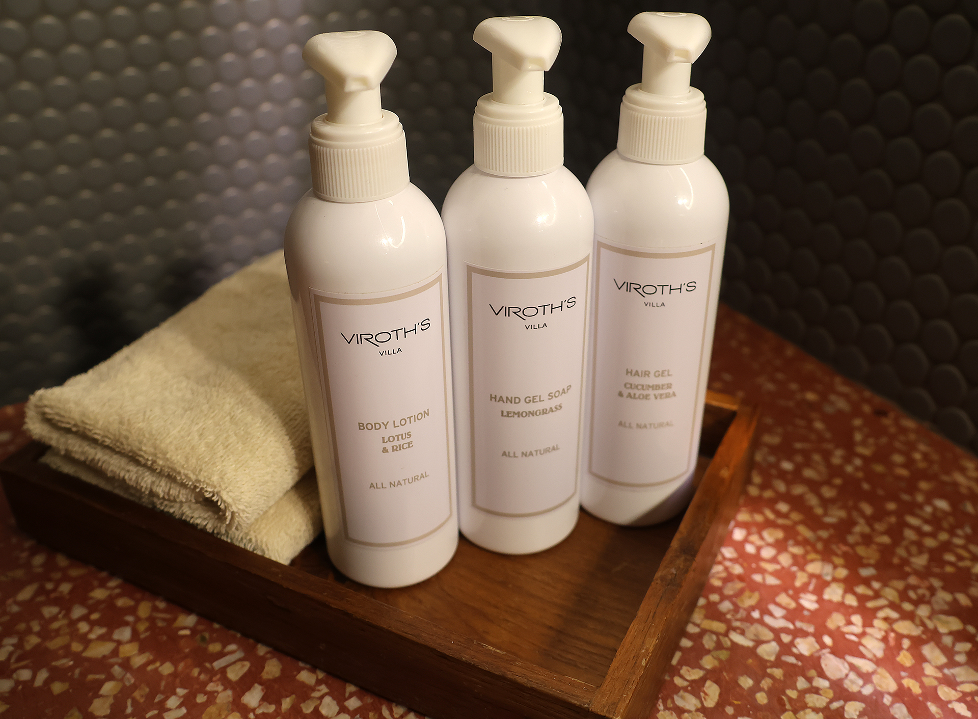 Bottles with pumps of lotus and rice body lotion, lemongrass hand gel soap, and cucumber and aloe vera hair gel were arranged neatly in a wooden box on the vanity with a couple of hand towels.