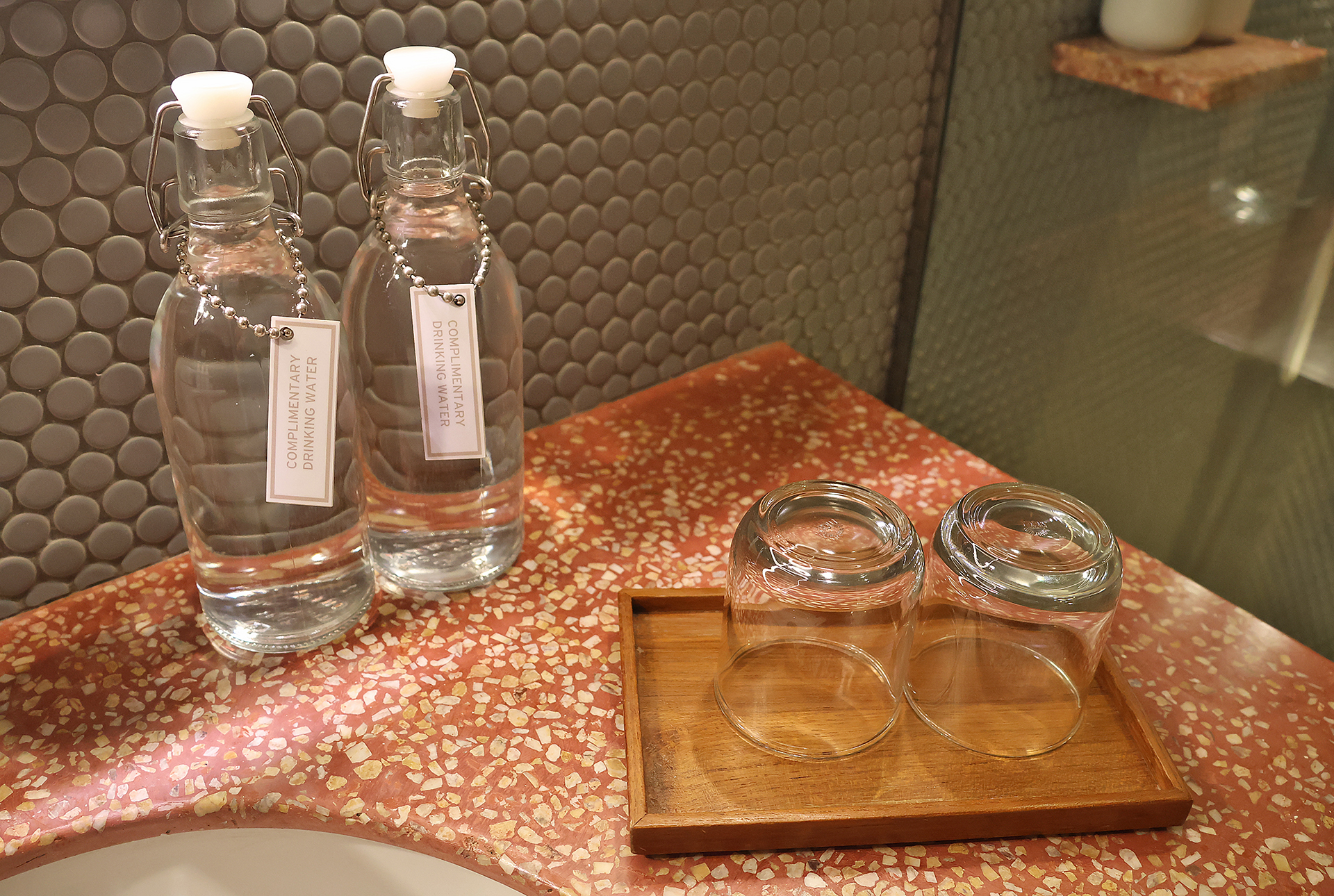 Two bottles of complimentary drinking water in glass bottles were refilled twice per day, which was plenty of drinking water. If one needed more water than that and did not want to use the sink in the bathroom, one can get fresh drinking water near the restaurant.