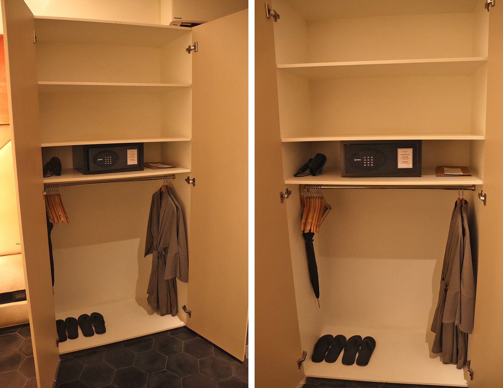 The closet contained flip-flop sandals, two robes, an umbrella, a safe, a hair dryer, and a laundry bag.