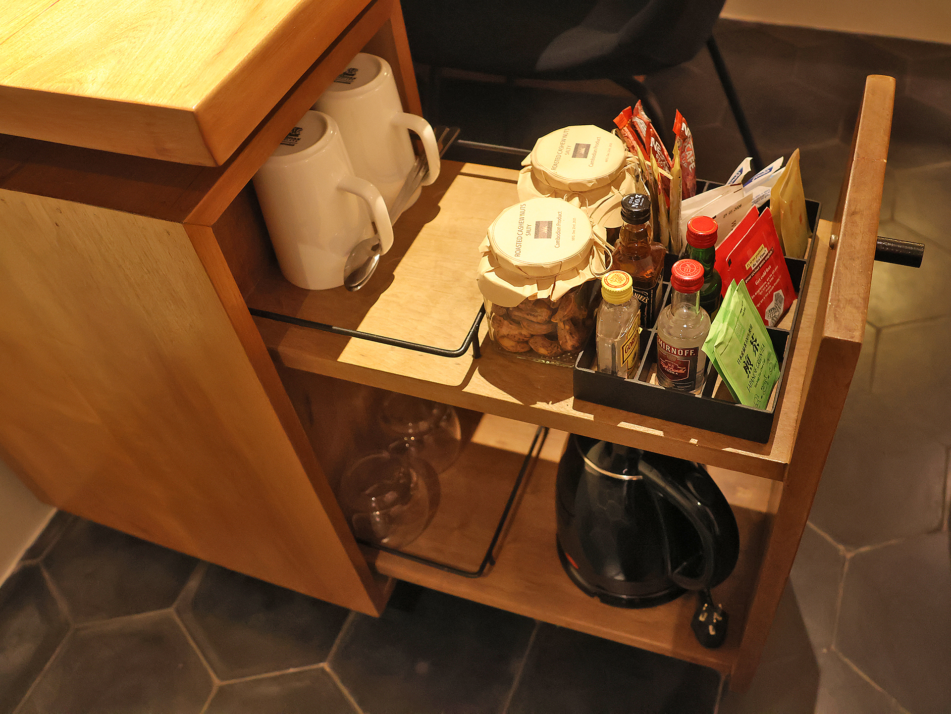 More minibar items were located under the left side of the desk — along with what is needed for a cup of coffee or tea.
