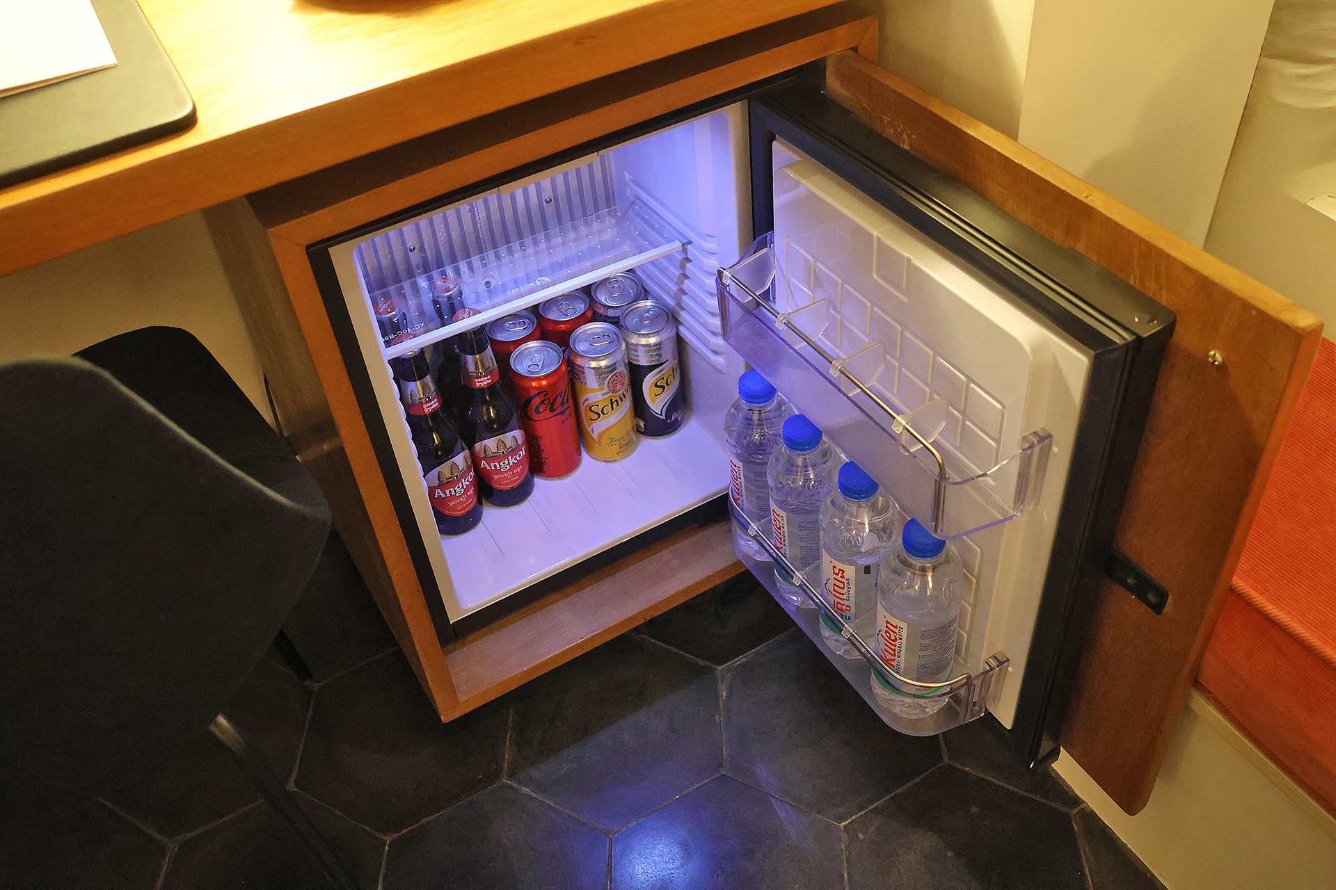 Under the right side of the desk was a refrigerator which doubled as a minibar.