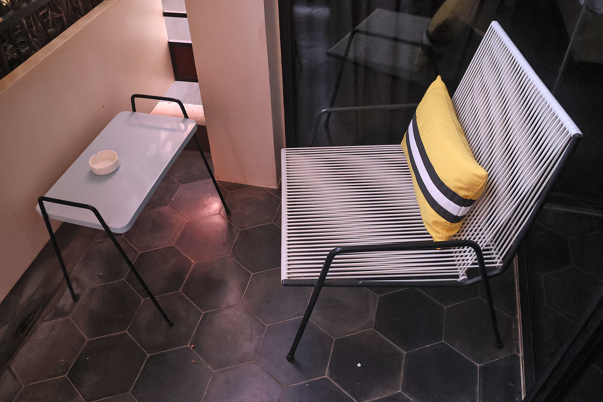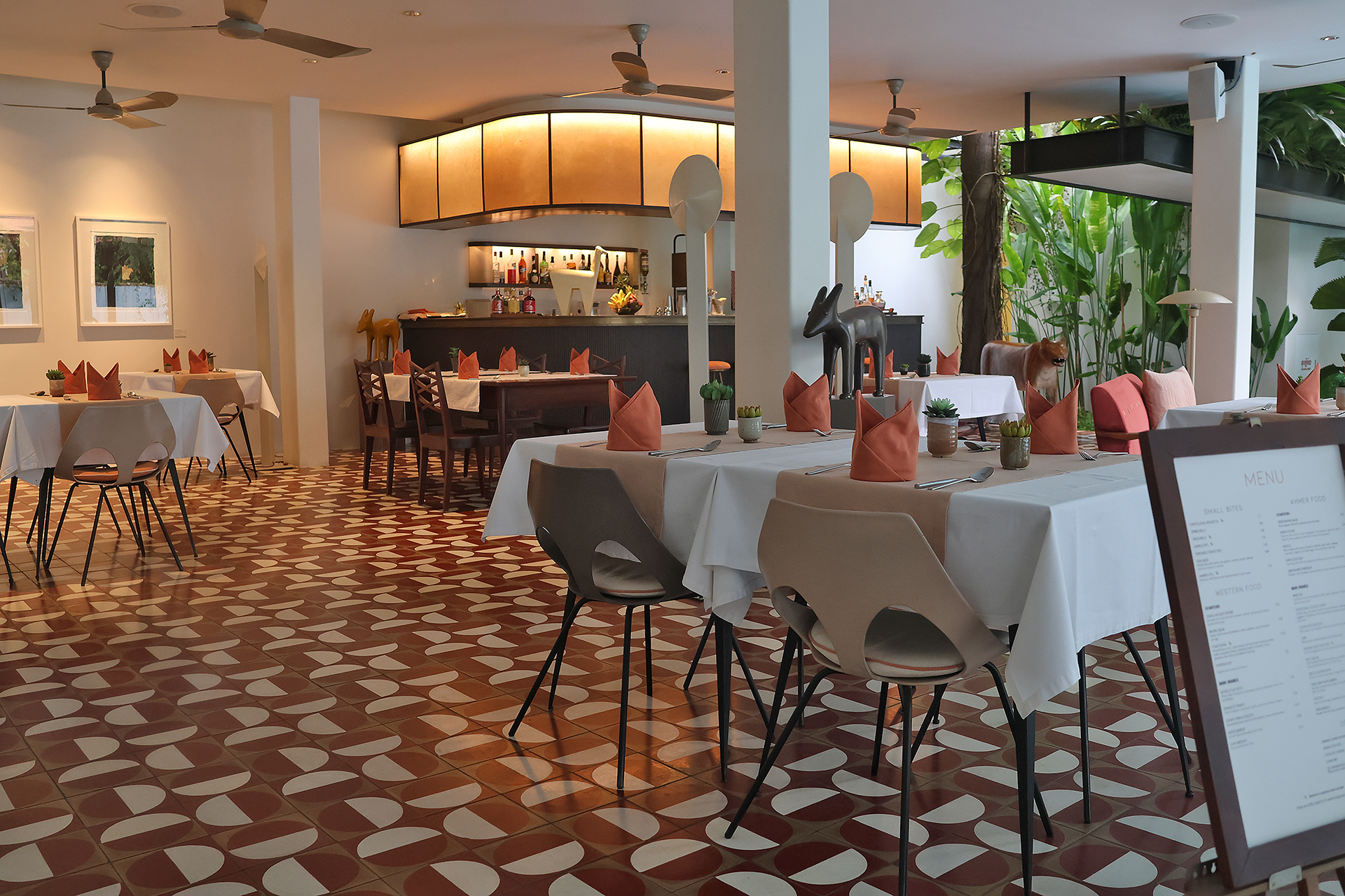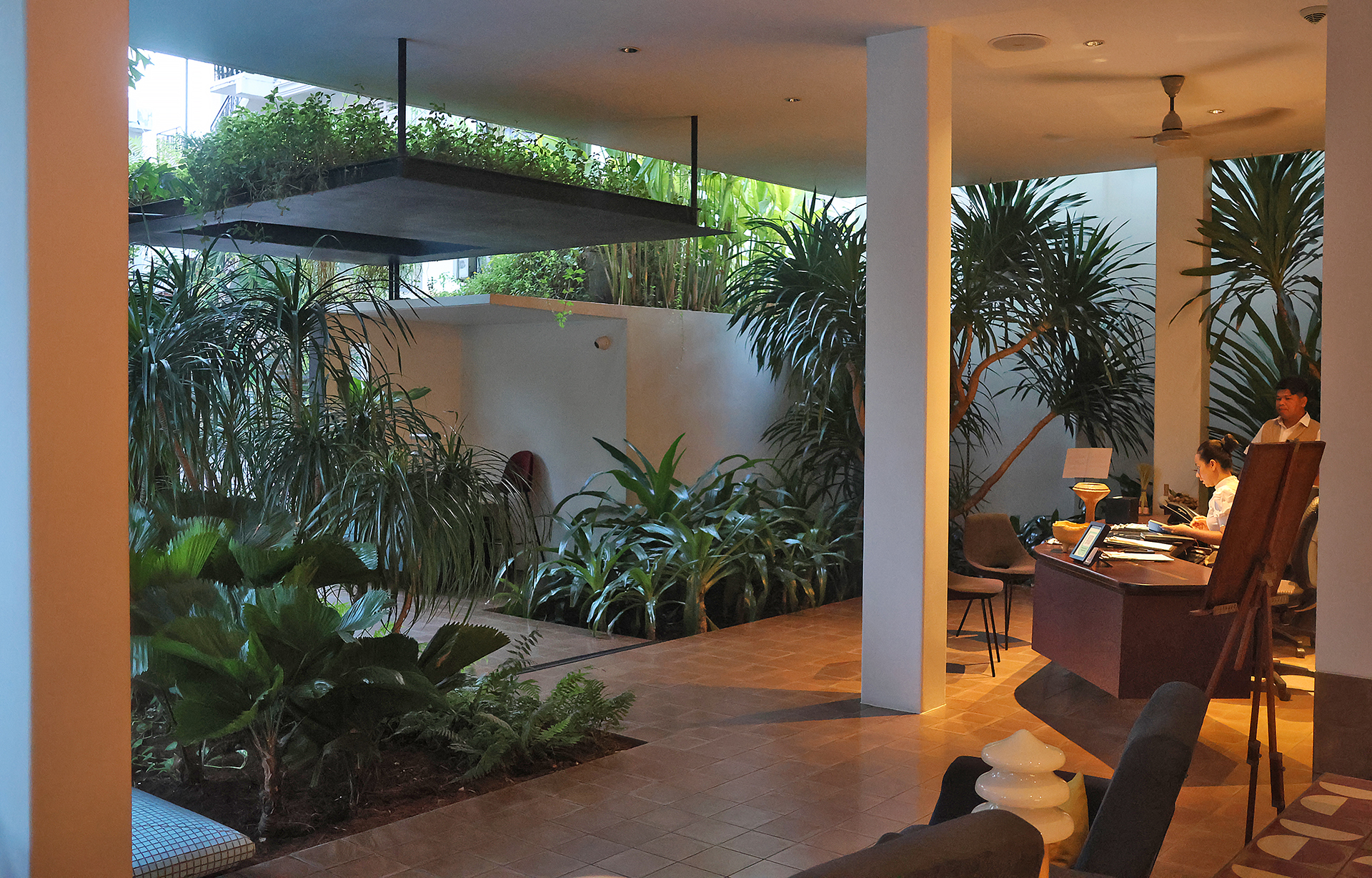 The front desk is located in an open-air area of the boutique hotel property, which includes the restaurant and the swimming pool. The entrance to the property is behind the shrubbery on the left in the above photograph.