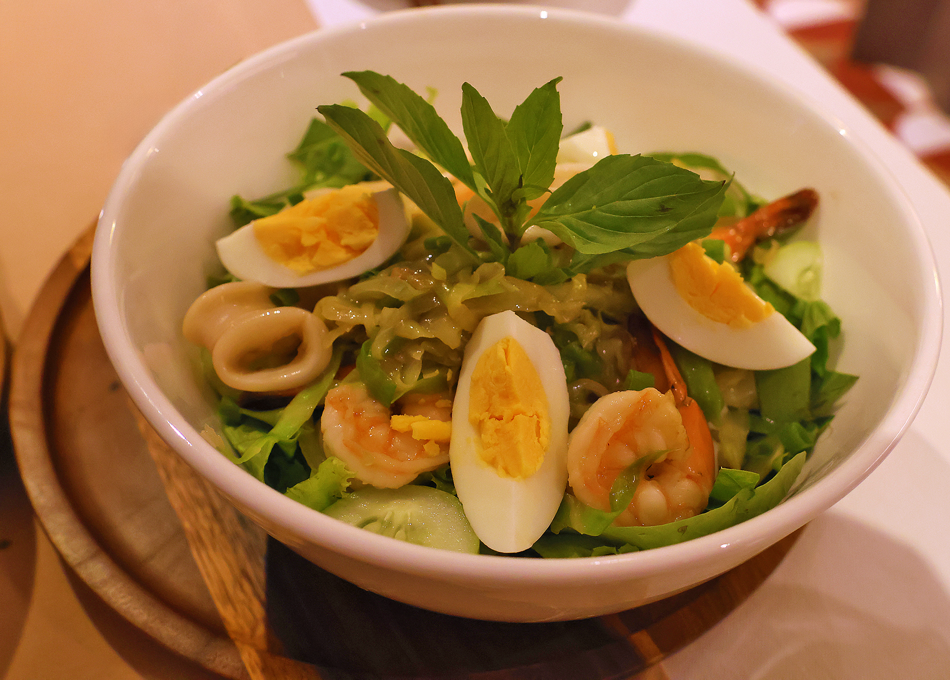 We started off with Miko La, which is comprised of rice noodles with a choice of beef or seafood, salad, basil, cabbage. cucumber, topped with boiled eggs, nuts, and khmer dressing. Seafood was chosen. $8.25