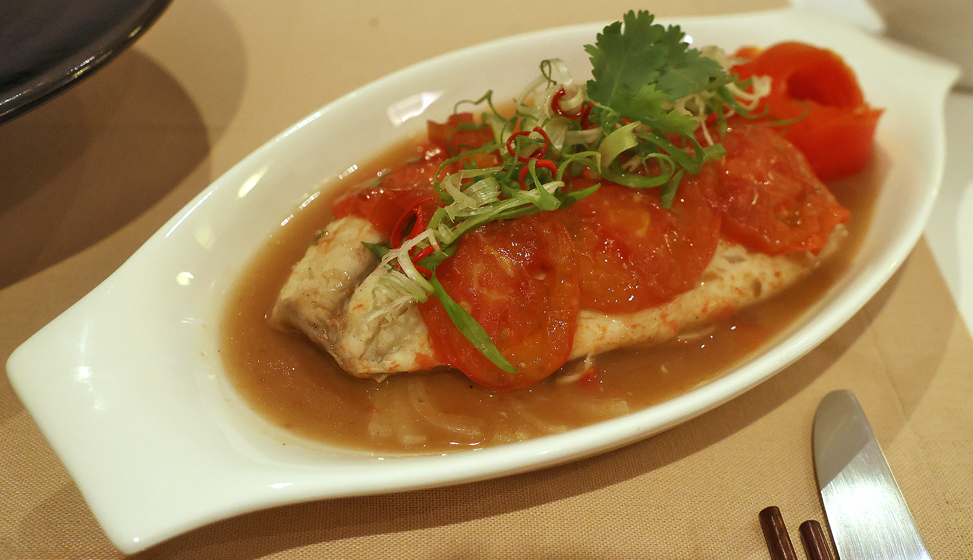 The Steamed Fish Fillet had red snapper fish steamed in white wine sauce, onions, tomatoes, sweet basil. spring onions, peanuts, and local herbs. $11.00