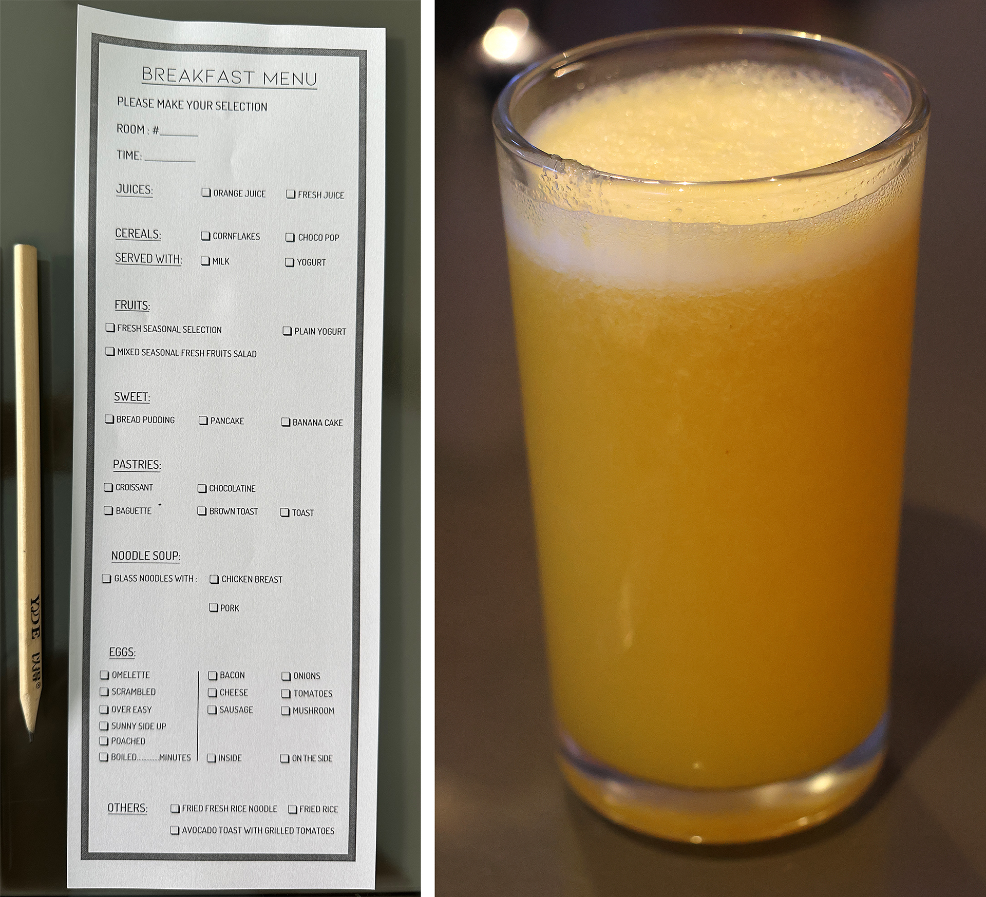 Breakfast was included in the room rate. A paper menu with a pencil is given to each person at the table. At first, the menu looked like it was for a few items for a continental breakfast; but we were told by the server that we may choose whatever items we wanted — and we were always asked if we wanted more food or beverages at no extra charge.