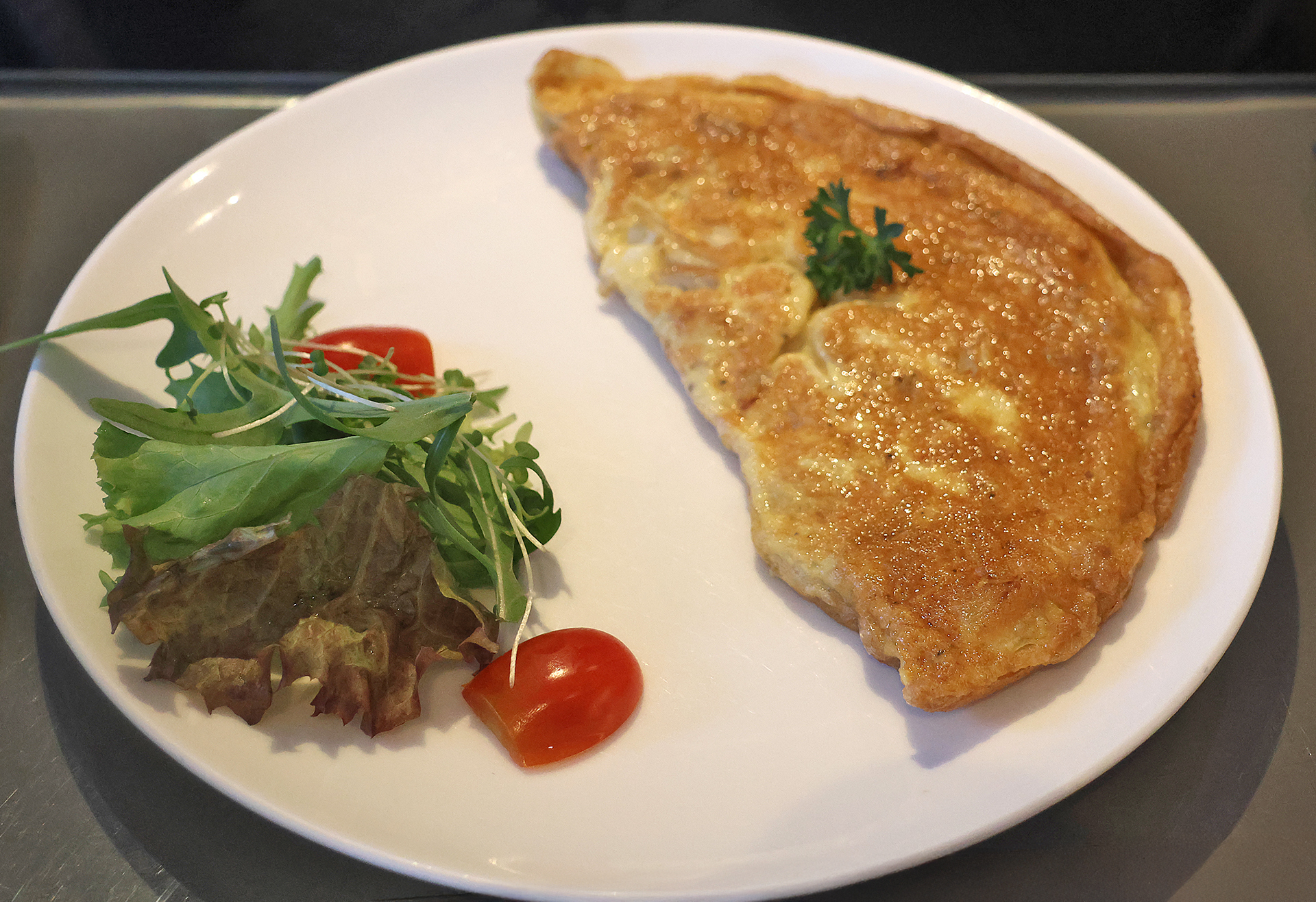 Fresh greens and a halved cherry tomato accompanied the omelette.