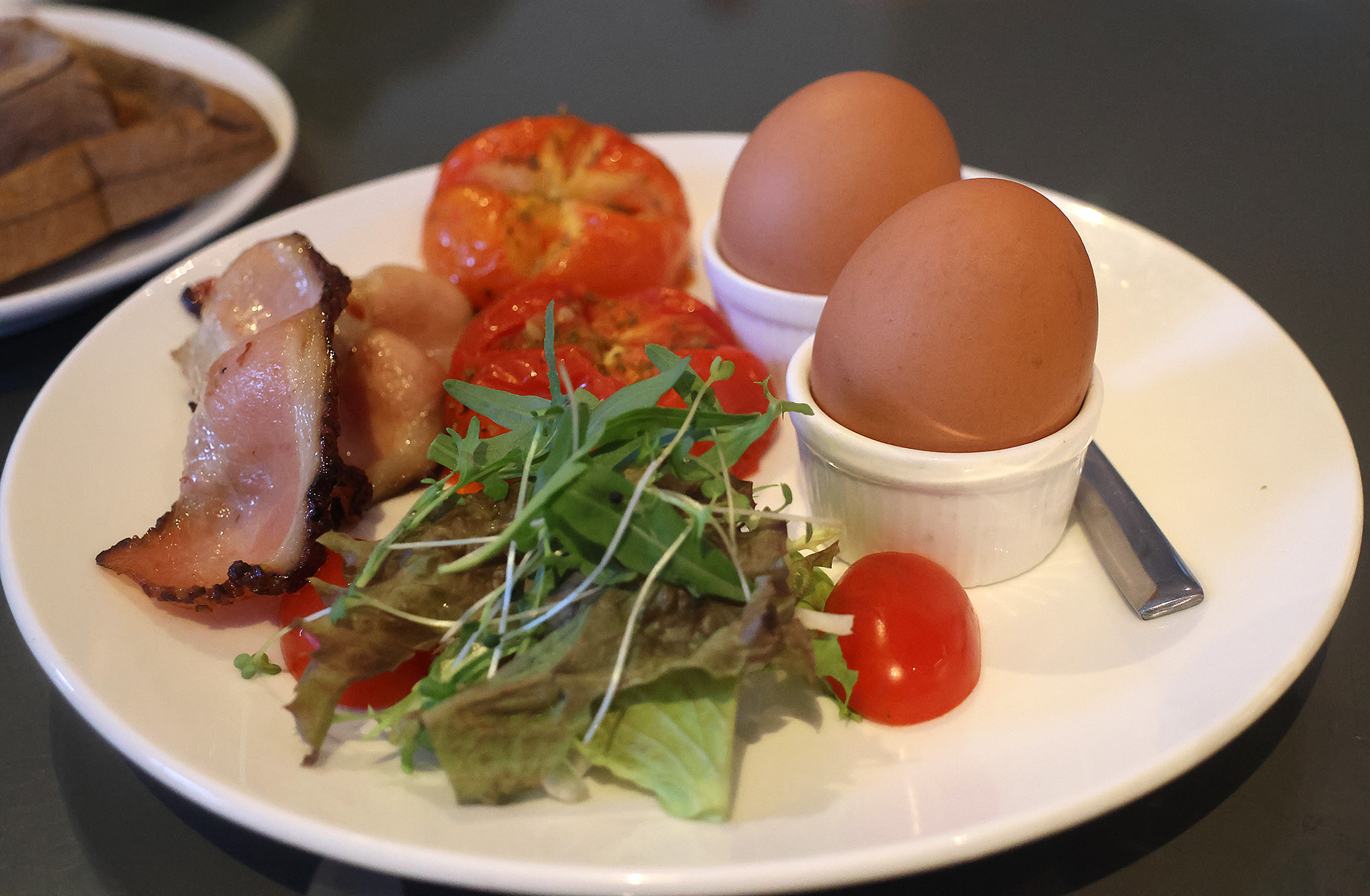 The bacon that came with the two hard-boiled eggs, the roasted tomatoes, fresh greens, and a halved cherry tomato was rather underdone…