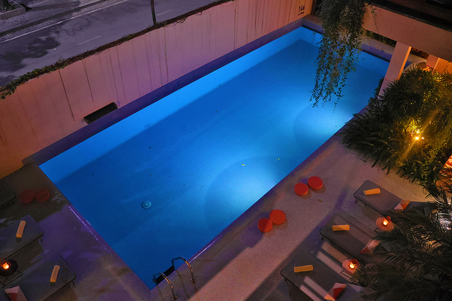 As with the remainder of the common area of Viroth’s Villa, the swimming pool was located outside and was open until 10:00 in the evening — which meant an opportunity for a night swim in somewhat heated water. The black bar installed in the wall is a fountain, which was activated when guests use the swimming pool. Towels are provided in all of the seating areas around the swimming pool.