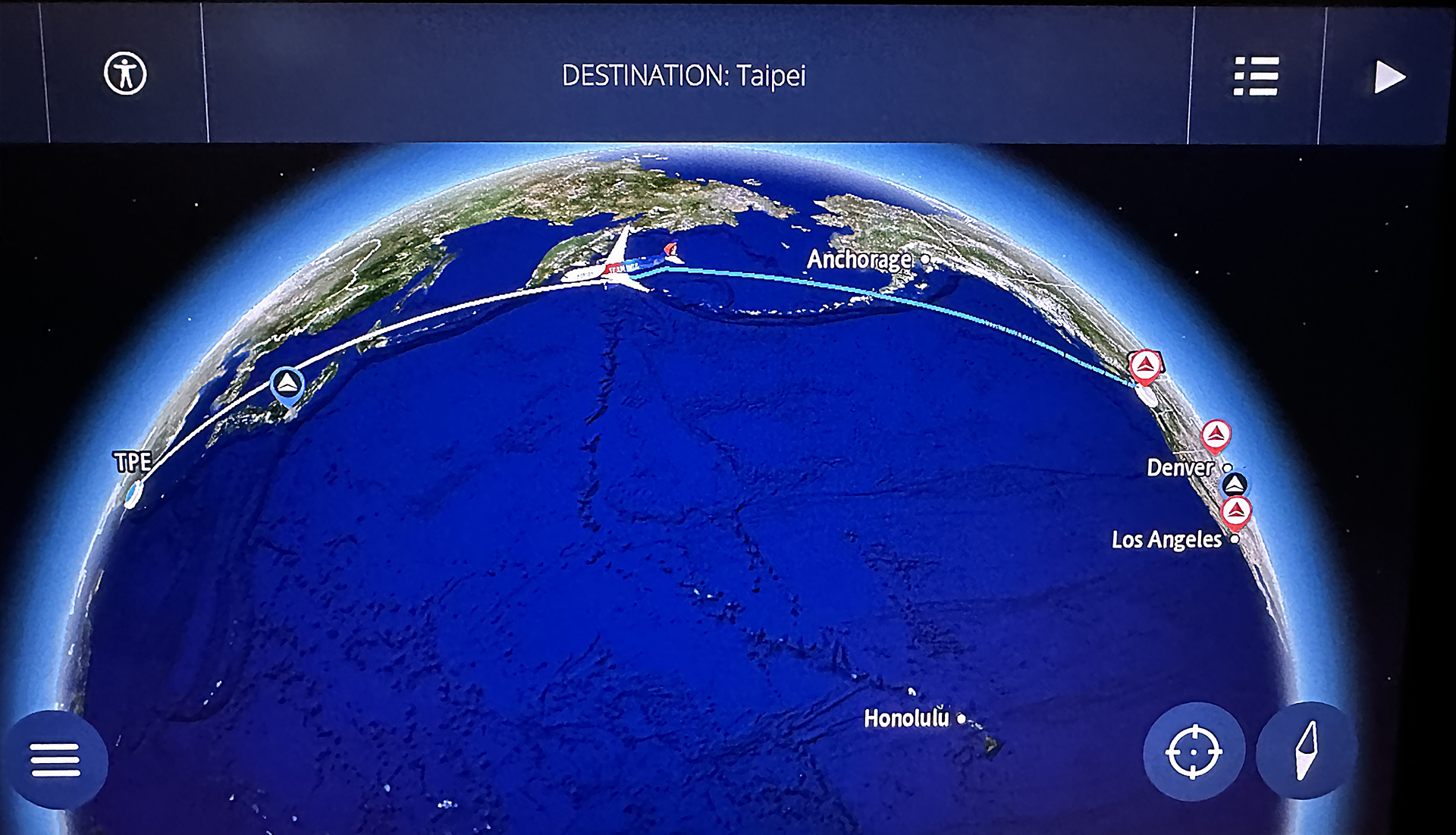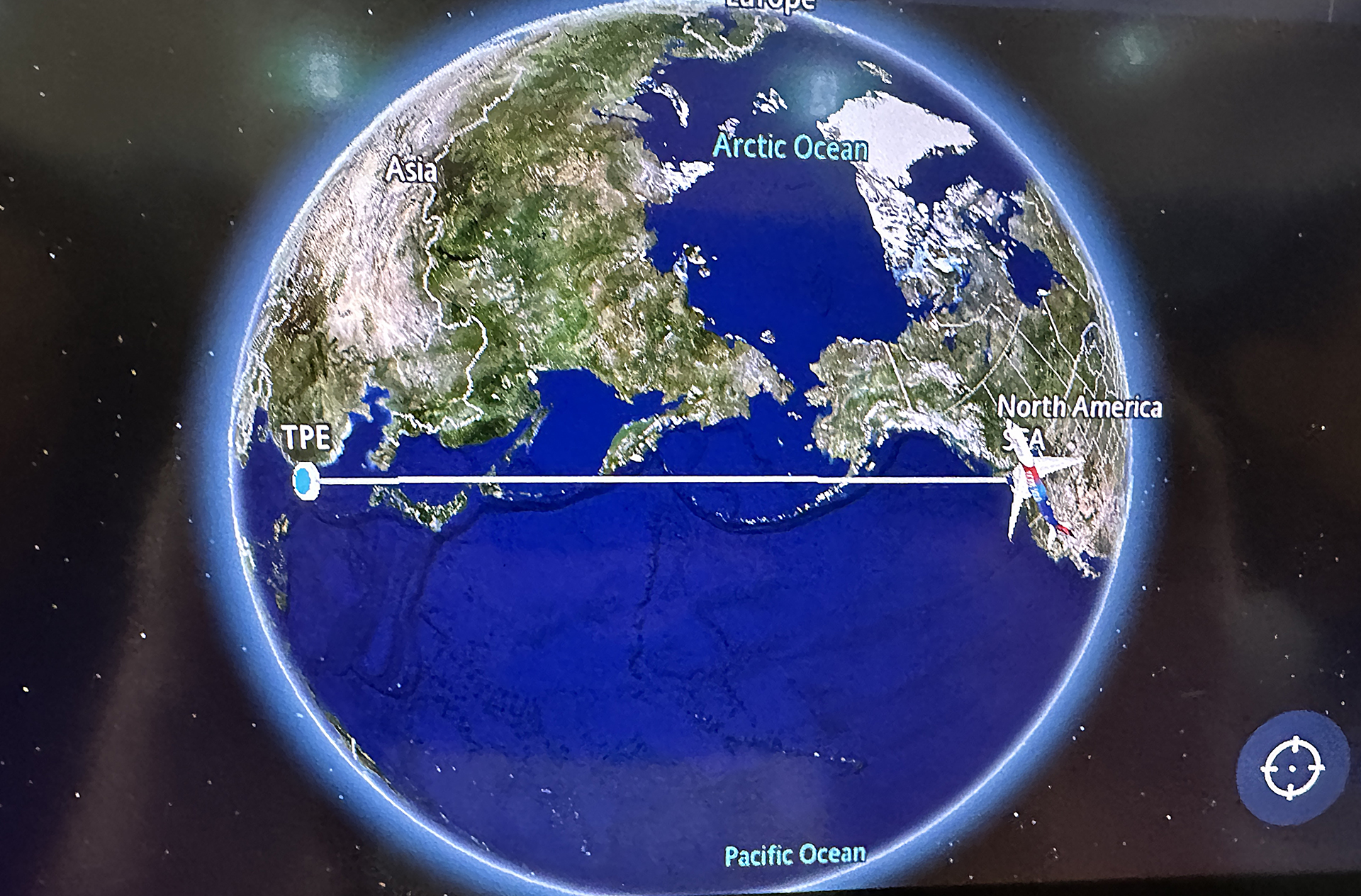 …but in fact, I used the interactive flight map that was included in the in-flight entertainment system aboard the airplane to adjust the view of the Earth to show that the airplane did indeed travel in a straight line along the shortest route possible between Seattle and Taipei — so the airplane actually took the most efficient routing possible for its flight path in terms of time and usage of fuel. This route is known as the great circle route, which is the shortest distance between two points on the surface of a sphere — especially when viewing it on a globe or a map that more accurately emulates a sphere.